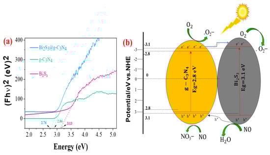 Figure 6 shows the optical analysis of the prepared composites. The band gap of the synthesized photocatalyst is shown in Figure 6a, which defined the electric conductivity of the photocatalysts. The Tauc method was introduced to determine the band gap of the photocatalyst. Based on the relationship between the Eg and the optical absorption, the band gap energies of the Bi2S3, g-C3N4, and Bi2S3@g-C3N4 were evaluated. A wider band gap is reduced through the doping of metal oxides. The band gap of the Bi2S3@g-C3N4, observed as 2.76 eV, was the gap between the bonding molecular orbitals and the antibonding molecular orbitals. The doping process, by adding Bi2S3 and g-C3N4, altered the Fermi level, replaced the CB in g-C3N4, and replaced the VB in Bi2S3, which narrowed the distance between the CB and VB. In addition, these dopant atom orbitals acted as intermediate states or bridged the gap between the valence and conduction band of electrons of the Bi2S3 and g-C3N4, some new bonds were formed, and the number of molecular orbitals increased resulting in shorter energy for electronic transitions (a lower bandgap). Furthermore, a smaller particle size led to enhanced electron transfer properties, preventing electron–hole recombination and reducing the band gap of the composite, thereby increasing the photocatalytic activity. When the band gap was reduced, excitation occurred at lower irradiation powers. The determined energy band gap was estimated as 2.86 eV and 3.1 eV for the g-C3N4 and Bi2S3, respectively, while for the Bi2S3@g-C3N4, it was estimated as 2.76 eV. Figure 6a shows the observed band gaps as compared to the Bi2S3 and g-C3N4; the Bi2S3@g-C3N4 showed an improvement in light absorption, electron level structure, surface area, particle size, and morphology. The Eg of the Bi2S3@g-C3N4 corresponded less to the Bi2S3 and g-C3N4, which showed the potential for photocatalytic activity. The nanojunction of the Bi2S3 and g-C3N4 was advantageous for utilizing and absorbing the solar light, which was the cause of the formation of more electrons and performed as a good photocatalyst. For the photocatalytic mechanism of the prepared heterojunction composites shaped by the junction of the Bi2S3 and g-C3N4 shown in Figure 6b, both composites contributed a supportive platform to carry the photogenerated charge carriers from the valence band (VB) to the conduction band (CB) of the Bi2S3 and g-C3N4. When the Bi2S3 and g-C3N4 became excited under solar light, a photoinduced electron–hole pair was generated. In the Bi2S3, the electrons at the CB recombined rapidly with the holes at the VB of the g-C3N4 due to the synergistic effects of an inner electric field, Coulomb interaction, and band bending; during this time, the functional electrons and holes remained attached to the CB and VB of the g-C3N4 and the Bi2S3, respectively, for participation in the redox reaction. Based on the result, the charge carriers were efficiently separated and utilized, and the heterojunction photocatalyst boosted the photocatalytic activity, which was notably improved.