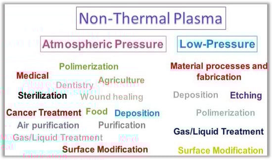 Nowadays, the great focus of NTP is on atmospheric pressure applications. This includes uses in air sterilization [], food preservation and treatment of dormant seeds [,], antimicrobial agent in medical and dental areas [,,,,,], and activated liquids to be applied in the fields mentioned above [,,,]. However, NTP is well consolidated and has been prominent for decades in fabrication and surface modification at low pressure. This highlight of NTP is due to its distinct superiority in the fabrication and modification of materials concerning traditional means of chemical reaction []. Figure 2 shows some examples of NTP applications in different areas. Regarding low-pressure plasma application, we can subdivide the main applications resulting from the plasma interactions with the matter as (i) material deposition, (ii) surface etching/modification, and (iii) gas/liquid treatment. In the three subdivisions, the processes are carried out at a low process temperature, which is advantageous compared to conventional thermal processes. This low temperature is only possible because the plasma promotes chemical reactions with electrons that allow it to catalyze reactions that in conventional routes would need extremely high neutral gas temperatures. The high reactivity of plasma-based processes can cause high surface selectivity, greater production efficiency, and a greater variety of starting materials [,,,,,,]. The preservation of thermosensitive surfaces can also be processed by NTP [].