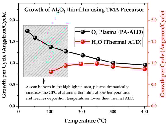 First, it is possible to highlight the high reactivity resulting from the reactive species generated in the gas phase that activates the deposition substrates’ surface. The high reactivity generated by the plasma can be adjusted by changing the type of gases, varying the flow and pressure of the gases, changing the plasma power [,]. It is also possible to control the bombardment of ions, i.e., the energy dissipated locally, by adding grids between the plasma and the substrate, generating a plasma generation area and another process area, as well as grounding the substrate or changing its polarization [,]. All of the adjustments mentioned above help provide a high reactivity supplied to the deposition surface, independent of the substrate’s temperature or the material used as substrate. As seen in Figure 1, NTPs have relatively low heat flux, which is a consequence of Tg < Te and the short time intervals of the ALD cycle that prevent the plasma from heating the material. Thus, PA-ALD achieves a higher growth rate per cycle at lower temperatures [], as shown in Figure 5, reaching thermosensitive materials and areas of technology previously inaccessible by thermal ALD.