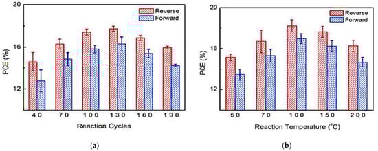 Power conversion efficiency (PCE) as a function of (a) reaction cycles; (b) process temperature. Reprinted with permission from Ref. []. Copyright 2016, Royal Society of Chemistry.