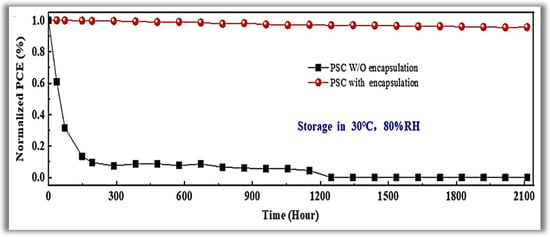 Time evolution of power conversion efficiency for the perovskite solar cells with and without encapsulation under high humidity. Reprinted with permission from Ref. []. Copyright 2020, Elsevier.