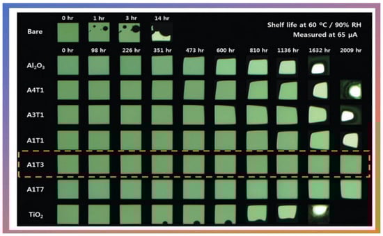 In 2016, Hoffmann et al. [] were the first to publish a study of thin-film gas permeation barriers based on Al2O3 cultured by atmospheric pressure plasma-enhanced atomic layer deposition (APPALD). The work was not applied directly to OLEDs but opened the way for new applications. The authors grew Al2O3 thin films using TMA, and Ar/O2 plasma at 80 °C. The substrates used for the analysis were polyethylene terephthalate coated with tin oxide and indium, another substrate used was Si. It is worth mentioning that these films were grown at atmospheric pressure and showed a WVRT of the order of 5 × 10−5 g.m2⋅day−1. In the same year, Kim et al. [] examined the effects of the oxide ratio on the WVTR of Al2O3/TiO2 nanolaminate films (50 nm) prepared by PA-ALD. They used TMA as a precursor of Al2O3 and tetrakis-(dimethylamino)-titanium (TDMAT) as the precursor of TiO2. O2 plasma was used as an oxygen source for both precursors at 100 W. The authors demonstrated that the Al2O3/TiO2 nanolaminate film exhibited optimal properties for a 1:1 atomic ratio of Al2O3/TiO2 with the lowest value of WVTR of 9.16 × 10−5 g.m2⋅day−1 at 60 °C and 90% RH (shelf-life can be observed in Figure 9).