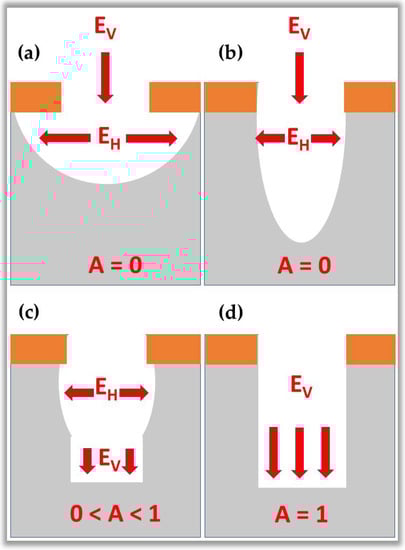 where and are the horizontal and vertical etching rates, respectively. Figure 13a,b show isotropic etching profiles ( 0) with lateral under-mask etching and no under-mask etching. Figure 13c shows the partially anisotropic profile (), and finally, Figure 13d shows the perfectly anisotropic profile ( 1), i.e., etching on the vertical sidewall [].