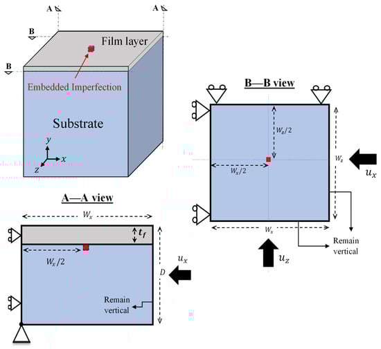 The model consisted of a thin film bonded to a compliant substrate with an embedded imperfection. The film surface was square-shaped, and the substrate was sufficiently thick in comparison with the film. Figure 1 shows the problem geometry, boundary conditions, and directions of the applied displacement employed in the finite element analysis. All materials were chosen as linear elastic isotropic solids in the present study. The initial thickness of the film layer, tf, was 0.1 μm. One of the common polymeric film materials used in organic optoelectronics and photovoltaics, namely, P3HT:PCBM [], was considered. The Young’s modulus of the thin film was Ef = 7300 MPa [], and the Poisson’s ratio was νf = 0.35. The elastomeric substrate layer was PDMS, with Young’s modulus Es = 2.97 MPa [] and Poisson’s ratio νs = 0.495 (set slightly smaller than 0.5 to mitigate potential convergence issues). As schematically shown in Figure 1, the problem domain contained a single embedded imperfection. It was a regular finite element at the exact center of the top layer elements in the substrate, immediately below the film–substrate interface. The embedded imperfection, while underneath the interface in the substrate domain, was assigned the material properties of the film layer. This approach has been systematically tested and proven to be a reliable way to trigger deformation instabilities in our earlier studies [,,].