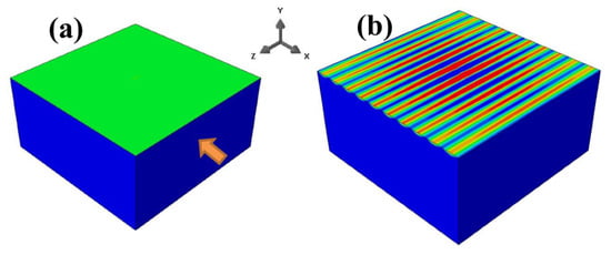 At the end of the second phase, , which is the same as the case presented in Section 3.2. Figure 4a,b show the surface patterns at the end of each phase of the sequential loading. After phase 1, the surface remained flat because the applied displacement had not reached the critical value for uniaxial compression (see Figure 2f). At the end of phase 2, a checkerboard-like pattern appeared, but it was not of the exact square type, as can be seen from the different numbers of waves along the x- and z-directions.