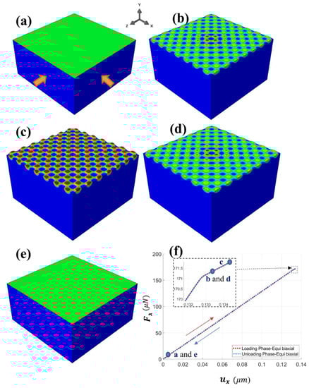 Attention was then turned to in-plane equi-biaxial loading along the x- and z-directions (BR = 1). The dominant mode of surface wrinkling at the onset of instability caused by an equi-biaxial loading is the square checkerboard pattern [,]. Although the pattern will eventually evolve into the labyrinth mode in the post-instability regime [], the current section is limited to the primary mode of instability. Figure 3 shows the simulated evolution of the square-checkerboard wrinkles during loading (a–c) and unloading (c–e). The maximum equi-biaxial displacement of −0.138 μm was applied during loading, which corresponded to , with being 0.0024. The development of a wrinkling pattern from the pre-instability flat face to the square checkerboard pattern can be clearly seen in Figure 3a–c. During the unloading phase (Figure 3c–e), the surface pattern gradually faded away, and the flat surface reappeared. Figure 3f shows the overall load–displacement response in the x-direction during the equi-biaxial loading/unloading. The points of the snapshots of Figure 3a–e are also labeled along the curves. As can be seen, similar to the case of uniaxial compression discussed in Section 3.1, the equi-biaxial loading and unloading responses also followed the same path. The entire history of the reversible deformation involving mechanical instabilities could thus be captured by our modeling approach in a straightforward manner.