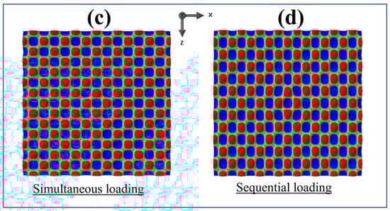 Aside from the uniaxial and equi-biaxial loadings considered above, one can explore a non-equi-biaxial loading with the BR value falling between 0 and 1. Here, we will discuss the case of BR = 0.7. Three sets of simulations with the maximum applied displacements of and , corresponding to a final deformation of (), were first considered: (i) simultaneous loading along the x- and z-directions, (ii) two-phase sequential loading with x-compression applied first and z-compression applied afterward, (iii) two-phase sequential loading with z-compression applied first and x-compression afterward. In the following, the two sequential cases (ii) and (iii) are also referred to as “sequential loading 1” and “sequential loading 2,” respectively. The numerical results are shown in Figure 6, with Figure 6a–c displaying the final wrinkle patterns at the end of simultaneous loading, sequential loading 1, and sequential loading 2, respectively. As can be seen, different wrinkle patterns were obtained with different deformation paths, while the loading biaxiality was identical (BR = 0.7) at the end of each simulation.