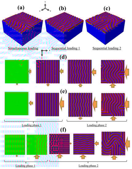 Figure 7 shows the results for another set of simulations at BR = 0.7, with a smaller target strain of . The maximum applied displacements were and . The final wrinkling configurations are shown in Figure 7a–c, respectively, for the three cases of simultaneous loading, sequential loading 1 (x-compression first), and sequential loading 2 (z-compression first). The history-dependent wrinkle patterns are again evident. The deformation progression is shown in Figure 7d–f for the cases of simultaneous loading, sequential loading 1, and sequential loading 2, respectively. As in the case of Figure 6, simultaneous loading in Figure 7d and sequential loading 1 (x-compression first) in Figure 7e resulted in a similar kind of pattern evolution, but the detailed wrinkle morphologies were not the same. An interesting pattern evolution, however, was observed for sequential loading 2 in Figure 7f (with z-compression first). Here, the primary instability did not occur at the end of the loading phase 1. This was due to the smaller target strain; the maximum applied displacement () corresponded to the applied strain of which was still below the critical strain of . At the beginning of the second loading phase, only a slight compression of ux triggers the formation of 1D wrinkles in the original z-direction. With increasing x-compression, the bifurcation mode changed to herringbone and then labyrinth.