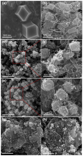 SEM images of (a) ZIF-67, (b) CNT@CoS, (c,d) C@CS/NCL-50, (e,f) C@CS/NCL-100, (g) C@CS/NCL-150, (h) C@CS/NCL-200.