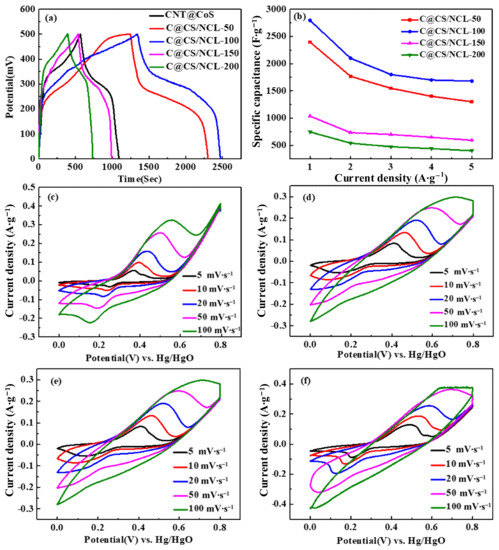 (a) Comparation of the GCD curves of the materials’ electrodes with different masses of nickel source, (b) their capacitance at different current densities, and CV curves of CNT@CoS/NiCo-LDH at different scan rates; (c) C@CS/NCL-50, (d) C@CS/NCL-100, (e) C@CS/NCL-150, and (f) C@CS/NCL-200.