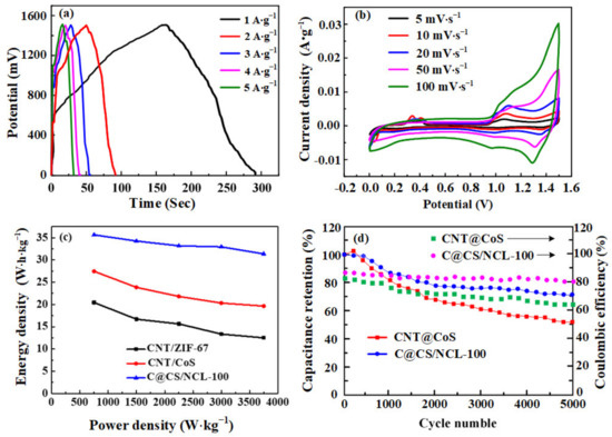As shown in Figure 9a, 0–1.5 V is considered as an ideal working potential window for the GCD profile of the device. The device with C@CS/NCL-100 exhibited the specific capacitance of 114.1, 90.4, 87.0, 86.2 and 84.4 F·g−1 (the capacity is 47.7, 37.7, 36.3 and 35.2 mAh·g−1) at the current density of 1, 2, 3, 4 and 5 A·g−1, respectively, which is better than that of CNT@CoS at the same current density (87.9, 76.3, 69.8, 65.0 and 62.7 F·g−1, respectively, or 36.6, 31.8, 29.1 and 26.1 mAh·g−1, respectively). It can be attributed to the nanocage-like structure of C@CS/NCL-100 prepared with nickel source. The deposition of nanosheets increases the roughness of the nanocage surface. Therefore, the specific surface area and active sites were improved to increase the specific capacitance of the material, comparing with CNT@CoS. It can be judged from Figure 9b that 0–1.5 V is the ideal voltage window for the electrochemical test of the device.
