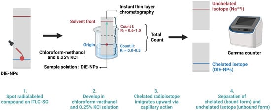Radioactive labeling yield schematic. Instant thin-layer chromatography (ITLC) silica gel was utilized in an ITLC system with a solvent system. A paper chromatography strip was employed to determine the radioactive labeling yield after labeling and subsequently developed in chloroform-methanol and 0.25% KCl solution. Analyzes of bound and unbound forms were measured using a dosage calibrator.