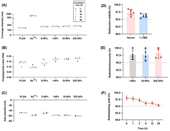 Physiochemical properties and characterization of the nanoparticles after incubation times of 3, 24, 48, 72 and 96 h. (A) Z-average diameter (nm). (B) Polydispersity index. (C) Zeta potential (mV). (D) Radioactive stability (%) of DIE-NPs incubated in 20% fetal bovine serum and 1 PBS over 24 h. (E) Radiochemical purity (%) of I-NPs, DI-NPs and DIE-NPs over 96 h. (F) Radiolabeling yield of DIE-NPs over 24 h. Data are given as mean ± standard deviation (n = 3).