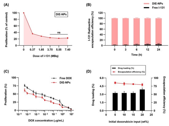 The two-dimensional (2D) in vitro therapeutic optimization. (A) MTT assay in vitro cytotoxicity of DIE-NPs at dosages of 0, 0.37, 1.85, 3.70, 5.55, and 7.40 MBq after 24 h incubation. ns = no statistically significant difference in efficacy of destroying cancer cells between 3.70, 5.55, and 7.40 MBq (p > 0.05). (B) I-131 radioactive encapsulation efficiency (%) of DIE-NPs and free I-131 after 0, 3, 6, 12 and 24 h incubation. (C) In vitro cytotoxicity using MTT assay of DIE-NPs and free DOX after 24 h incubation. (D) Drug loading and encapsulation efficiency (%) of 5%, 10%, 15%, and 20% initial doxorubicin input (wt%). Data are given as mean ± standard deviation (n = 3).