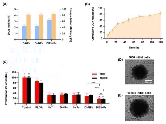 Therapeutic efficiency of nanoparticles. (A) Drug loading and encapsulation efficiency of D-NPs, DI-NPs, and DIE-NPs. (B) Cumulative amount of DOX release after 0, 1, 3, 6, 12, 24, 36, 48, 72, 96, and 120 h. (C) In vitro three-dimensional (3D) MG-63 human tumor spheroid proliferation (% of control) using Cell Titer-Glo® 3D cytotoxicity assay of DIE-NPs compared to control, PLGA, Na131I, D-NPs, I-NPs, DI-NPs, and DIE-NPs treatment of 5000 initial cells/well and 10,000 initial cells/well after 72 h incubation. ns = no statistically significant difference in efficacy of proliferation (% of control) between DIE-NPs treatment of 5000 and 10,000 initial cells/well (p > 0.05). * denotes significance between control and DIE-NPs of 5000 initial cells/well (p < 0.05). ** denotes significance between control and DIE-NPs of 10,000 initial cells/well (p < 0.05). *** denotes significance between DI-NPs and DIE-NPs of 5000 initial cells/well (p < 0.05). **** denotes significance between DI-NPs and DIE-NPs of 10,000 initial cells/well (p < 0.05). (D,E) The morphology of three-dimensional (3D) MG-63 human tumor spheroid of 5000 and 10,000 initial cells were imaged in bright-field using LionHeart live cell imaging. [10 images, scale bar = 200 μm]. Data are given as mean ± standard deviation (n = 3).