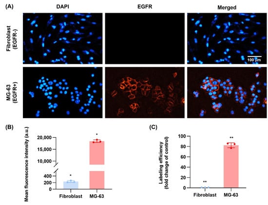The MG-63 (EGFR+) and fibroblast (EGFR−) cells intracellular binding/uptake (n = 3) was ascertained by incubating the cells for 24 h with DIE-NPs at an activity of 3.70 MBq at 200 µL/well final volumes. Next, the MG-63 and fibroblast cells were rinsed with 1 PBS, and fixed with 4% paraformaldehyde for 20 min to conserve the samples before being washed with 1 PBS. They were then stained with 4′,6-diamidino-2-phenylindole (DAPI) dye for 30 min at 37 °C before being rinsed twice before fluorescent live cell imaging microscope examination.