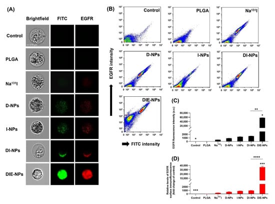 Figure 4D,E demonstrate flow cytometer results for unconjugated PLGA NPs and DIE-NPs. The region evaluated (red line) was adjusted to the upper right corner, which indicates the presence of conjugates containing Alexa Fluor 647 anti-human EGFR antibody (fluorescently positive events). The large population in the lower left corner is based on non-fluorescent dust/debris observed in flow cytometer results for pure PBS.