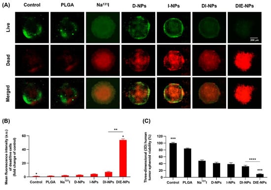 In addition, to assess the cell viability of MG-63 spheroids, a 3D Cell Titer-Glo® cell viability assay was conducted after 72 h treatment with control, PLGA, Na131I, D-NPs, I-NPs, DI-NPs, and DIE-NPs at an I-131 equivalent activity of 3.70 MBq (100 µCi). The medium was removed as indicated by the manufacturer, and 100 µL of Cell Titer-Glo® reagent was added to every well, with blending for 2 min, and 30 min incubation at room temperature. The luminescence signal was then measured using a plate reader (Tecan, Infinite 200 PRO).