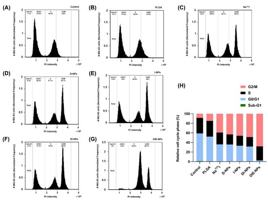 For at least 24 h, MG-63 cells were cultured at 37 °C with 5% CO2 in an incubator after being seeded at 105–106 cells/well in DMEM supplemented media. After 48 h of incubation, the cells were treated with control, PLGA, Na131I, D-NPs, I-NPs, DI-NPs, and DIE-NPs. Once the medium was removed, the cells were rinsed with 1 PBS and harvested using trypsin/EDTA). Then the trypsinized cells were rinsed with an assay buffer, and the ensuing cell pellets were suspended at a density of 1 106 cells/mL in fresh assay solution. Next, the cells were fixed and permeabilized for at least 2 h with 1 mL of a fixative agent before staining with propidium iodide (PI). Afterward, the cells were centrifuged at 500 g for 5 min, and the fixative was wholly removed. Cell cycle analysis was then performed using ImageStreamX Mk II flow cytometer after the cell pellets were suspended in the PI staining solution and incubated for 30 min at room temperature in the dark.