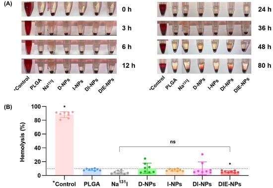 To inhibit the formation of blood clots, the plasma was extracted from human blood in the presence of heparin anticoagulant. RBCs were suspended at 8 109 cells/mL in positive control (DMSO), Na131I (activity 3.70 MBq), D-NPs, I-NPs (activity 3.70 MBq), DI-NPs (activity 3.70 MBq), and DIE-NPs (activity 3.70 MBq) and centrifuged for 5 min at 500 g. At 0, 3, 6, 12, 24, 36, 48, and 80 h, the supernatants were collected at 37 °C to test blood lysis. To calculate the hemolysis (%), a BCA protein assay kit was used to evaluate the protein in the samples before measuring the hemoglobin absorbance using a microplate reader (OD = 562 nm).
