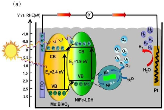 The variable valence state of metal cations of LDHs directly promotes the transfer and separation of charge carriers. Low-valence metal cations are oxidized to high-valence metal cations by the photogenerated holes, which improve the transfer and separation of photogenerated charge carriers. For example, Bai et al. [] synthesized the NiFe-LDH/Mo-BiVO4 heterostructure by an electrodeposition method. The photogenerated holes transferred from BiVO4 nanoparticles to NiFe-LDH due to a type II staggered band structure of the heterostructures. At the same time, the photogenerated holes oxidized Ni2+ from NiFe-LDH to Ni3+and Ni4+. The Ni3+and Ni4+ take part in oxygen evolution reaction (OER) and improve the performance of PEC for decomposing water (Figure 3a). In the work of Shao et al. [], a ZnO@CoNi–LDH core−shell nanoarray was prepared by an electrosynthesis method. The Co2+ was oxidized to Co3+/Co4+ by the photogenerated holes, which enhanced the efficiency of photogenerated charge carrier separation. Moreover, the Co3+/Co4+ served as co-catalysts to improve water splitting ability.