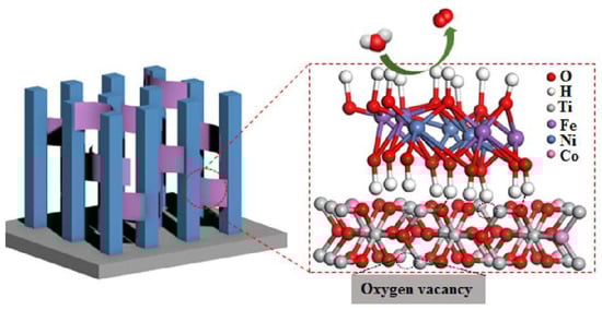 The LDH surface has abundant surface hydroxyl groups that are nearly perpendicular to the host layer []. The hydroxyl groups not only effectively adsorb reactants [], but also form interfacial chemical bonds with other semiconductor surfaces, thereby facilitating the transport of interfacial charge carriers []. For example, Liu et al. [] deposited NiFe-LDH onto Co-intercalated TiO2 by electrodeposition. The hydroxyl groups of NiFe-LDH form hydrogen bonds with TiO2 (Figure 4). Therefore, under illumination, the holes in Co-TiO2 VB can be transferred to the VB of NiFe-LDH through hydrogen bonding in time to participate in water decomposition, which improves transfer and separation of interfacial photogenerated charge.