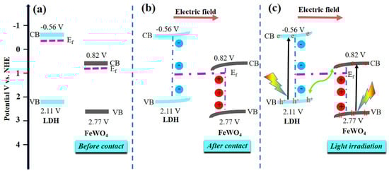 Schematic energy band diagrams of FeWO4 and NiAl−LDH (a) before and (b) after heterojunction formation. (c) Photogenerated charges transfer pathway in FeWO4/NiAl−LDH heterostructure under light irradiation []. Copyright 2021 Elsevier.