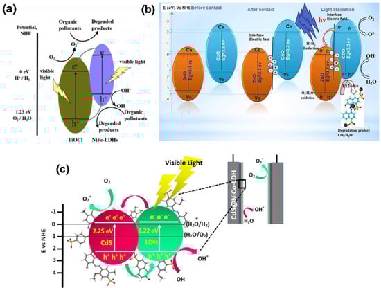 (a) The photocatalytic mechanism of BiOCl/NiFe−LDH heterostructure []. Copyright 2015 Elsevier. (b) The possible photodegradation mechanism of ZnO/CoO []. Copyright 2022 Elsevier. (c) Proposed photoelectrocatalytic degradation mechanism of CdS/NiCo−LDH heterojunctions []. Copyright 2022 Elsevier.
