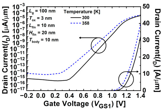 Figure 3 shows the transfer characteristics of the proposed 1T-DRAM cell at different temperatures of 300 K and 358 K. Note that the threshold voltage (Vth) of the proposed device was 1.05 V and 0.99 V at temperatures of 300 K and 358 K, respectively. Vth was obtained at ID = 10−7 A/μm. When the temperature increased from 300 K to 358 K, the off-current increased because carrier generation was accelerated by the high temperature. In addition, because the carrier density increased the recombination rate, the retention time decreased.