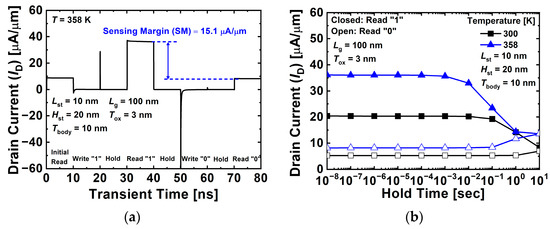 Figure 4a shows the transient characteristics of the proposed 1T-DRAM cell at 358 K. The sensing margin is defined as the difference between the read “1” current and read “0” current. The sensing margin of the proposed device was 15.1 μA/μm at T = 358 K. The operation mechanism of the 1T-DRAM consists of program, erase, read, and hold operations. The program operation uses the BTBT mechanism to generate holes on the side of gate 2 in the body area. During the erase operation, a negative bias is applied to the drain and the potential barrier disappears; thus, the holes accumulated on the side of gate 2 in the body region move to the drain region. The bias conditions for the operation of the 1T-DRAM are summarized in Table 2. Figure 4b shows the variation in the read currents for the “1” and “0” states at different temperatures of 300 K and 358 K. Conventionally, the retention time is defined as the time elapsed until the initial sensing margin reaches 50%. The retention times of the proposed 1T-DRAM were 1.48 s and 123 ms at temperatures of 300 K and 358 K, respectively. As shown in Figure 3, increasing the temperature increased the carrier density and recombination rate and decreased the retention time.