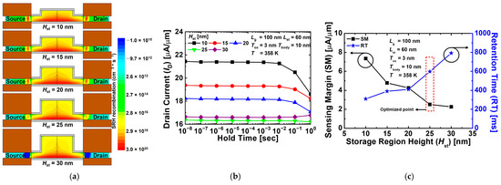 Figure 9a shows the contour maps of the SRH recombination rate for the proposed 1T-DRAM with different Hst values in the hold state “1” operation. As mentioned earlier, during program operation, BTBT occurs in the circular dotted line area in Figure 5a. However, a small amount of BTBT also occurs between the fin-shaped gates 1 and 2. As Hst increases, less tunneling occurs because the distance between gates 1 and 2 increases in the fin-shaped region. Therefore, as shown in Figure 9a, as Hst increases, the BTBT rate decreases, and the number of generated holes decreases, so the SRH recombination rate decreases. Figure 9b shows the current corresponding to read “1”, and the number of holes created depending on the increase of Hst decreases and the current decreases. In the end, similar to the above-mentioned Lst optimization process, when Hst is 30 nm, the current corresponding to read “1” increases with time due to SRH generation and becomes unstable. Figure 9c shows the sensing margin and retention time of the proposed 1T-DRAM cell as a function of Hst. As Hst increases, fewer holes are generated, and sensing margin gradually decreases. Conversely, the retention time increases because the stored holes can be retained longer by the reduced SRH recombination rate. Notably, the proposed device with an Hst of 25 nm obtained a sensing margin of 2.51 μA/μm and a retention time of 598 ms at T = 358 K.