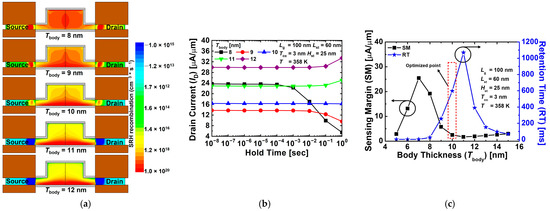 Figure 10a shows the contour maps of the SRH recombination rate for the proposed 1T-DRAM with different Tbody values in the hold state “1” operation. Since BTBT vertically occurs between gates 1 and 2 in the body region, as the Tbody becomes thicker, less BTBT occurs and fewer holes are created, so the SRH rate decreases. Conversely, as shown in Figure 10a, the thinner the Tbody, the more BTBT is generated, and the more holes are created, so the SRH rate is high throughout the body region. Figure 10b shows read “1” current of the proposed 1T-DRAM with different Tbody. Similar to the above-mentioned Lst optimization process, when Tbody is 11 nm, the current corresponding to read “1” increases with time due to SRH generation and becomes unstable. Figure 10c shows the sensing margin and retention time for the proposed 1T-DRAM cell as functions of Tbody. Since electrons are accumulated in the inversion channel on the side of gate 1 and holes are accumulated on the side of gate 2, when Tbody becomes thinner than a certain thickness, electrons and holes meet and recombination occurs, reducing sensing margin. In addition, when Tbody becomes thicker than a specific thickness, the sensing margin decreases because the BTBT rate decreases in the program operation. For our device, the final optimized parameters were Lst = 60 nm, Hst = 25 nm, and Tbody = 10 nm. Table 3 summarizes previously reported sensing margin and retention times for various 1T-DRAM cells. As can be inferred, the 1T-DRAM cell proposed in this paper exhibits excellent memory characteristics at T = 358 K compared with other device.