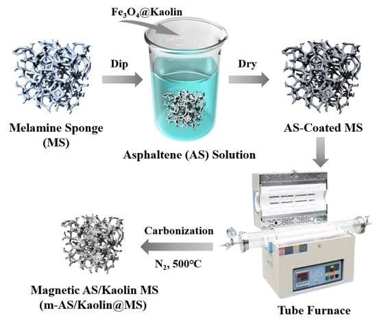 In the present work, we developed a novel magnetic superhydrophobic asphaltene/kaolin/melamine sponge (m-AS/Kaolin@MS) with three aspects of improvements in comparison to the previously reported modified sponges: Firstly, the fabrication of low-cost asphaltene-modified melamine sponges with controlled movement under magnetic field; secondly, the novel introduction of kaolin nanoparticles in the composite sponges, which could simultaneously enhance the absorption capacity and magnetic response [,,]; thirdly, an example usage scenario for the application of m-AS/Kaolin@MS to in situ burning of marine oil spills. Furthermore, the structure, wettability, oil absorbency, and flame resistance of the fabricated sponges were investigated.