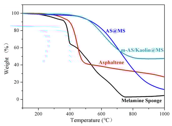 Thermogravimetric analysis (TGA) curves of the melamine sponge, asphaltene, AS@MS, and m-AS/Kaolin@MS samples.