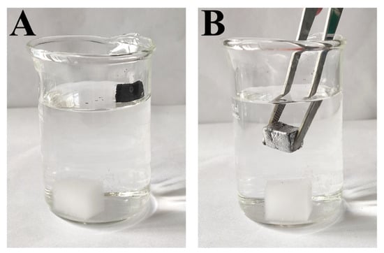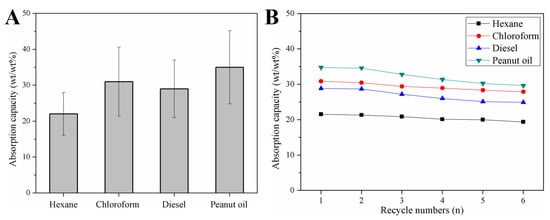 The absorption capacities of the modified sponge for various oils (i.e., hexane, ethanol, chloroform, diesel, and peanut oil) were quantitatively determined based on the weight at absorption saturation using Equation 1. As shown in Figure 8A, the modified sponge was able to absorb a variety of oils with high absorption capacities. However, the observed absorption values were lower than the values reported by Ruan et al. [] and Yang et al. [], likely due to the presence of magnetic Fe3O4 particles and the carbonization operation at 500 °C. The multifunctional features of the prepared sponges largely expand their usage in various practical applications, although with the sacrifice of reduced absorption capacity. After six recycles, the absorption capacity still remains more than 85% of the initial values, suggesting the excellent reusability of the m-AS/Kaolin@MS (Figure 8B).