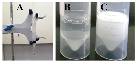 The presence of oil–water emulsions adds to the difficulty of cleanup of oil spills [,]. The demulsification property of the modified sponge was studied using a simple device as shown in Figure 10A. The liquid changed from turbid emulsions (Figure 10C) to transparent water (Figure 10B) by simply passing through the m-AS/Kaolin@MS under gravity, indicating the good demulsification capability of the modified sponge. This paves the way for its application in emulsified water cleanup.