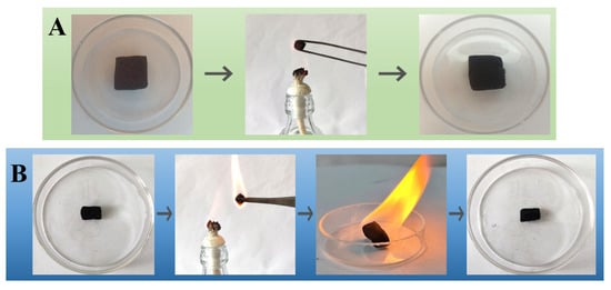 The refractory property of the modified sponge under burning conditions is investigated. As shown in Figure 11A, the m-AS/Kaolin@MS (without any absorbed oil) cannot be ignited by the alcohol lamp flame. No significant change was observed in the shape or size of the sponge sample under the burning flame (Figure 11A), illustrating its good fire resistance performance. Figure 11B corresponds to the m-AS/Kaolin@MS sample with absorbed crude oil. The sample was easily ignited by the lamp flame. A flaming fire was observed due to the presence of crude oil (Figure 11B, middle), showing a complete combustion with no smoke. The fire ended naturally after a few minutes when the crude oil was burned up. The m-AS/Kaolin@MS still retained its original shape and size after burning (Figure 11B, right), further demonstrating its good refractory property. The sponges after burning retained good absorption capability, which can be directly re-used for further absorption operations.