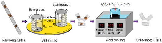 Raw long multi-walled carbon nanotubes (MWCNTs) with an average diameter of ~6 nm and an average length of 20 µm, and another kind of MWCNTs with diameters of 20–50 nm and an average length of 20 µm were purchased from Beijing DK Nano Technology Co., Ltd. These two kinds of MWCNTs were sonicated in a 3:1 (v/v) mixture of 98% H2SO4 and 70% HNO3 for 2 h to open the mouths. Then, the primary processed CNTs were ball milled with a planetary ball mill (QM-3SP04, 450 rpm) for 6–24 h. Finally, the ball-milled short CNTs were again sonicated in a 3:1 (v/v) mixture of 98% H2SO4 and 70% HNO3 for 40 min to remove nanoscale impurities (residual catalyst, amorphous graphite, internal defects, etc.). Here, sonication using a 100 W ultrasonic cleaner at 70 kHz was conducted. After sufficient washing, centrifugation (10,000× g, 3 min) and vacuum filtration, the resulting CNTs were dried at 60 °C for 24 h in a vacuum oven.