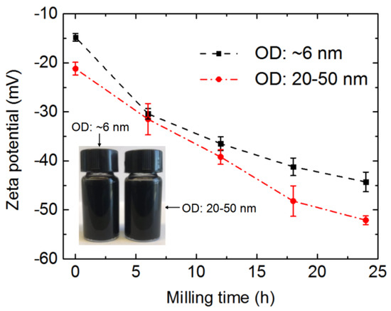 Figure 4 shows that the zeta potentials of the two kinds of MWCNTs decreased with the ball milling duration. For the same ball milling time, the wider MWCNTs had a lower zeta potential than the thinner MWCNTs, which can be attributed to the thicker MWCNTs having more negatively charged functional groups on their side walls and ends than the thinner MWCNTs [44,46]. The two kinds of ultra-short CNTs subjected to ball milling for 24 h were dispersed in deionized water using ultrasonic treatment to form suspensions with a concentration of 0.04 wt %, as shown in the insert of Figure 4. No precipitations were observed in the suspensions upon standing for 100 days. However, the raw long CNTs at the same concentration aggregated within one hour (Figure S1). Zeta potentials give an indication of the potential stability of a system, where high zeta potentials (either negative or positive) indicate electrically stabilized particles, while colloids with low zeta potentials tend to coagulate or flocculate [46]. For the purposes of this study, a better CNT dispersion was considered to benefit their filling.