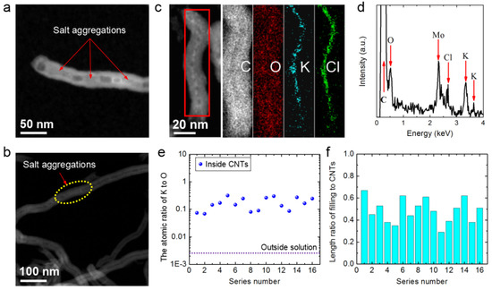 Our previous work [42] demonstrated the formation of highly concentrated ion aggregations inside MWCNTs soaked in dilute salt solutions. However, the CNT-filling efficiency was always low when the MWCNTs were long, i.e., tens of micrometers in length. Ion aggregations at the mouths of long CNTs were easily observed, as demonstrated by the high-angle annular dark field scanning transmission electron microscopy (HAADF-STEM) image of a CNT soaked in 0.14 M KCl shown in Figure 5a. Except for the tube mouth, most of the long CNT was empty, although some salt aggregations were observed in the middle of the long CNT (Figure 5b).