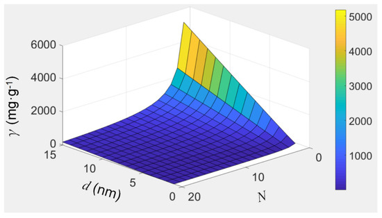 The visualization of equation 6, which shows how the filling capacity of CNTs, γ, varies with the inner diameter, d, and the total number of layers, N.