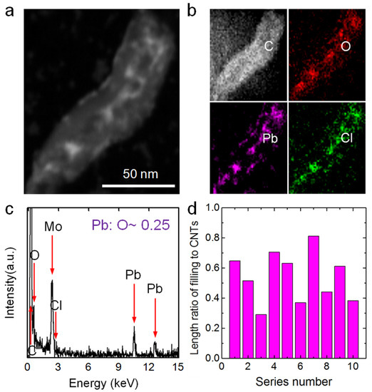 (a) An HAADF-STEM image of a PbCl2 aggregation inside an ultra-short CNT. (b) EDS mappings of elements C, O, Pb and Cl corresponding to the area in (a). (c) EDS results for the aggregation in (a) (the Mo signal comes from the Mo sample grid). (d) Filling length/total length ratios for aggregations inside 10 random ultra-short CNTs.