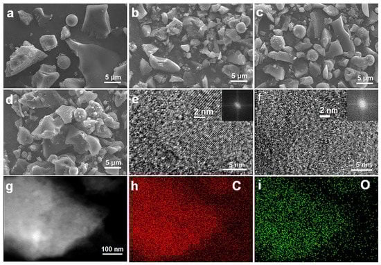 DQC has the lowest price and highest carbon yield at 1000 °C compared with other common carbonaceous precursors (Table S1). The carbon yield curve of DQC obtained by thermogravimetric analysis (TGA) is displayed in Figure S2. The morphologies of DQC were characterized before and after carbonization by scanning electron microscope (SEM) (Figure 1a–d) (partially magnified SEM images are shown in Figure S3). The SEM images show mostly irregular particles and few microspheres about 5~10 μm in size without significant differences. As shown in Figure S3a–d, the surface of the materials present with an increasingly smooth with surface, with few tiny particles attached. The microstructures of the carbon anode materials determine the electrochemical storage performance in LIBs. Therefore, we used transmission electron microscopy (TEM) to further explore the microstructure of the tailored carbon materials, which showed laminar sheet-like morphologies (C−1000 Ar−600 in Figure S4a,c, C−1000 H2−600 in Figure S4b,d). C−1000 Ar−600 displayed a significant lattice fringe with locally developed long-range ordered turbostratic graphical nanodomains (TGNDs), indicating its superior graphitic structure (Figure 1e), whereas C−1000 H2−600 displayed underdeveloped TGNDs in high-resolution TEM (HRTEM) images (Figure 1f). C−1000 H2−600 showed more defect edge sites and voids (Figure 1f) compared to C−1000 Ar−600 (Figure 1e) because hydrogen tailors the π-π stacking of a layered hexagonal pattern of graphite [,,]. The rich defect edge sites and voids of C−1000 H2−600 can support faster charge storage kinetics of lithium-ion due to the good electrode/electrolyte wettability, which is beneficial to improve the high-rate performance [,]. Energy-dispersive X-ray spectroscopy (EDS) mapping images demonstrate that the O atom is uniformly distributed in the carbon crystal lattice of C−1000 H2−600 (Figure 1g–i), and FTIR spectra further show that C−1000 H2−600 has more C=O/COO/C–O groups and C-H group than C−1000 Ar−600 and C−1000 (Figure S5).