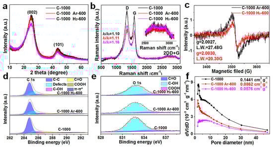 (a) XRD patterns of the three samples. (b) Raman spectra of the three samples. (c) EPR spectra of the three samples. XPS spectra of (d) C 1s and (e) O 1s of the three samples. (f) Pore size distribution of the three samples.