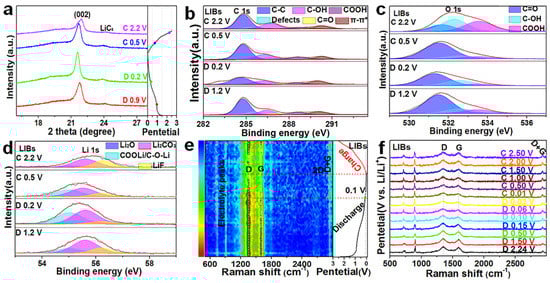 To fully understand the roles of oxygen functional groups of C−1000 H2−600, ex situ XPS and in situ Raman measurements were performed to reveal the underlying mechanisms. Table S10 displays the element percentages of C−1000 H2−600 based on total XPS spectra at varying discharge/charge voltages; the percentage of Li 1s increases and decreases, representing lithium-ion storage processes during the discharging/charging process, respectively. Although the deconvoluted C 1s and O 1s spectra are all divided into subpeaks of C=O, C−OH, and COOH, electrolytes containing large numbers of oxygen functional groups compared to relatively lower oxygen functional groups (<5 at %) have a larger deviation due to the complex decomposition products from the electrolyte; therefore, records were made without in-depth analysis (Figure 4b and Table S11 for the deconvoluted C 1s; Figure 4c and Table S12 for the deconvoluted O 1s; D, discharge; C, charge). The decreasing percentage of defects from the deconvoluted C 1s indicates the adsorption of lithium ions during the discharging process, and the increasing percentage of defects indicates the desorption process of lithium ions during the charging process. In the Li 1s spectrum of C−1000 H2−600 was divided into four deconvoluted peaks, namely Li2O, COOLi/COLi, Li2CO3, and LiF, were divided; an increasing percentage of COOLi/COLi implies the forward reaction processes represented by Equations (3) and (4) during the discharging process, whereas the decreasing percentage of COOLi/COLi is a reverse reaction processes during the charging process (Figure 4d for deconvoluted Li 1s; detailed proportions of groups are presented in Table S13) []. In situ Raman mapping (Figure 4e) and Raman spectra (Figure 4f) of C−1000 H2−600 were used to reveal the potential mechanism of lithium-ion adsorption on the microstructural active defect sites and the rich active function groups, as well as that of de-/intercalation into the TGND layers during the discharge/charge process in LIBs []. The position and intensity of the D band (near 1350 cm−1) and G band (near 1590 cm−1) are affected by the adsorption/desorption and de-/intercalation of lithium ions into the carbon framework. The decreasing intensity of the D band from the open-circuit voltage (OCV) to 0.01 V is caused by the confinement of the breathing motion of sp2 atoms in the rings at the edge planes, and the intensity of the G band is not only gradually weakened from OCV to 0.1 V, but the peaks are also slightly red-shifted (Figure 4e,f), preventing the occupation of the active defect sites and functional groups of C−1000 H2−600 by lithium ions []. The decreasing intensity of the G band from 0.1 to 0.01 V in LIBs is caused by the weakening of resonance for the intercalation of lithium ions into the underdeveloped TGNDs to achieve the lithiation process [,]. Finally, the recovery of the original D and G bands for C−1000 H2−600 after the charging process demonstrates its reversibility.