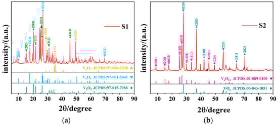 Generally, the S1 sample indicates that the low concentration of oxalic acid is not sufficient to completely reduce V2O5, and some unreacted V2O5, as well as intermediate products of V4O9 and V3O7, coexist in S1, while VO2 (M) is evident in S2, but the intermediate product of V6O13 remains present. Therefore, a higher concentration of oxalic acid is necessary to obtain pure VO2.
