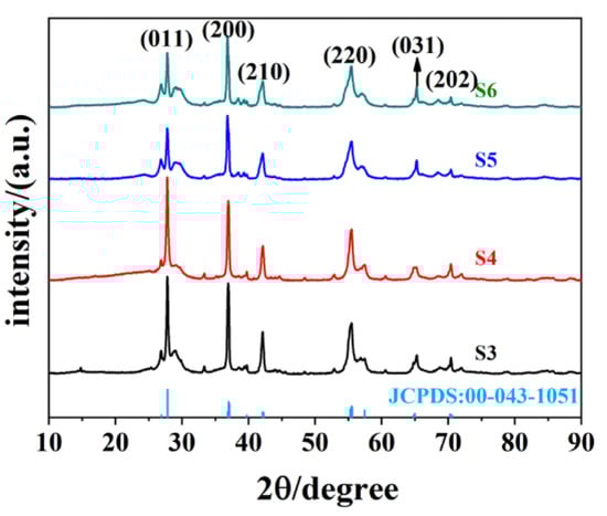XRD data for the hydrothermal product with different molar ratios between C2H2O4·2H2O and V2O5, and ratios for S3–S6 are 1.5:1, 2:1, 2.5:1, and 3:1, respectively.