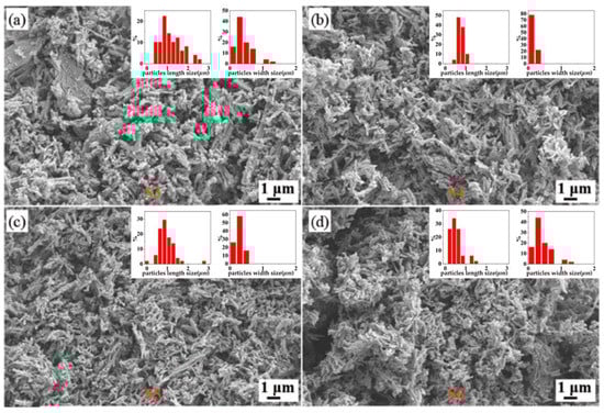SEM images of (a) S3 (reactants ratio 1.5:1), (b) S4 (reactants ratio 2:1), (c) S5 (reactants ratio 2.5:1), and (d) S6 (reactants ratio 3:1) samples.
