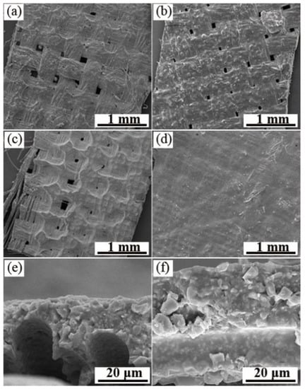 SEM images of the surface and interface of the coating. Coating surface on which the film-forming substance is present; (a) waterborne polyurethane; (b) PVP; (c) fluorocarbon resin; (d) fluorocarbon-resin-coated surface printed twice; (e) fluorocarbon-resin-coated cross-section printed once; and (f) fluorocarbon-resin-coated cross-section printed twice.