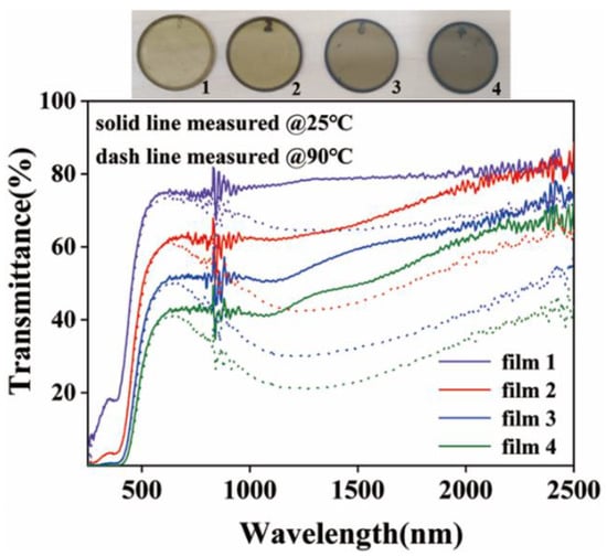 Figure 7 exhibits the optical transmittance curves of the coatings with different thicknesses formed by spin coating on the surface of quartz glass using the above-selected inks, in which the solid and dashed lines indicate the low- and high-temperature cases, respectively. The four samples were spin-coated 1–4 times, numbered 1–4 and in order, and the transmittance curves present that the low-temperature transmittance decreases with the increase in the coating’s thickness, from approximately 80% to less than 60%, but the optical-transmittance-modulation ability of the coating continuously increases with the increase in the thickness. The amount of infrared transmittance changes for samples 1, 2, 3, and 4 were 14%, 22%, 27%, and 29% @1.5 μm, respectively, while maintaining the visible transmittance at a value greater than 50%. Ru Chen et al. also prepared VO2 films in their study. The infrared transmittance changes in the films printed once and twice were 20% and 23%, respectively []. The thermochromic properties of the films prepared in our study are comparable to those presented in the literature.